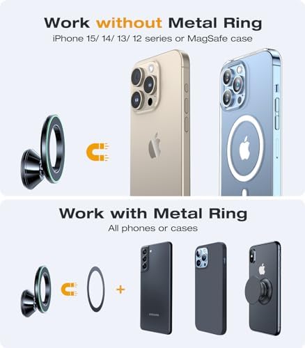 📱Perfect for MagSafe & any phone with any case! – This phone holder car not only 1: 1 precisely fits the MagSafe feature of iPhones, directly adhering to iPhone 12/13/14/15 series, but also magnetically attaches to all phones and cases with our included metal ring, such as Android phones and thick cases. The hollow design of the metal ring will not affect the wireless charging like other metal plates. Give you the ultimate simple experience that you can use right out of the box