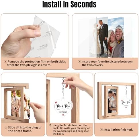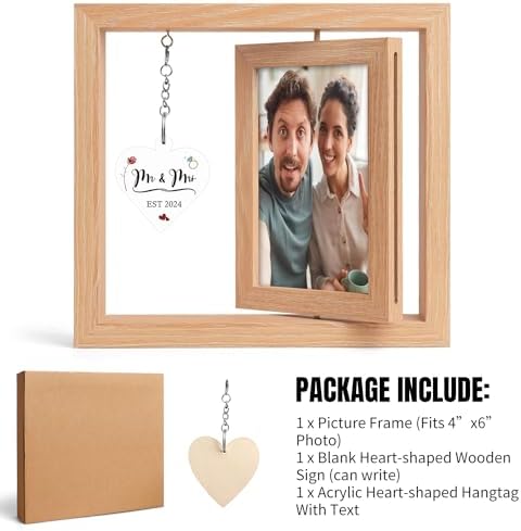 🌹【Gifts for New Mr & Mrs Picture Frame】The wedding gifts wood picture frame size is 9.05 in X 8.06 in, the internal rotating frame allows you to insert 2 4″ x 6″ vertical pictures like the most memorable moments with you and your loved one, date night, engagement, Wedding or anniversary photos, journey. Place the bride’s wedding gifts on the bedside, tabletop, desk, or shelf.