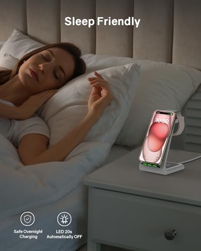More Considerate Design: ① Designed with dual charging coils, CIYOYO wireless charger stand provides vertical and horizontal charging for comfortable viewing to watch videos, and FaceTime while charging. ② Anti-slip silicone on the base avoids moving or flipping, and each charging area coated with antistatic silicone prevents sliding and scratching. ③ The Sleep-Friendly LED indicators turn off within 20s automatically, and will not disturb your sleep even for overnight charging on your bedside.