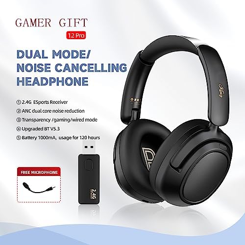 Gaming Headset with Microphone Bluetooth 5.3 Headphone Stereo Deep Bass Wireless Headphone for Gamer,Compatible with most gaming devices,No delay 50ms.The battery is 1000 mAh, without ANC on can used for 120 hours, and with ANC on is 80 hours.